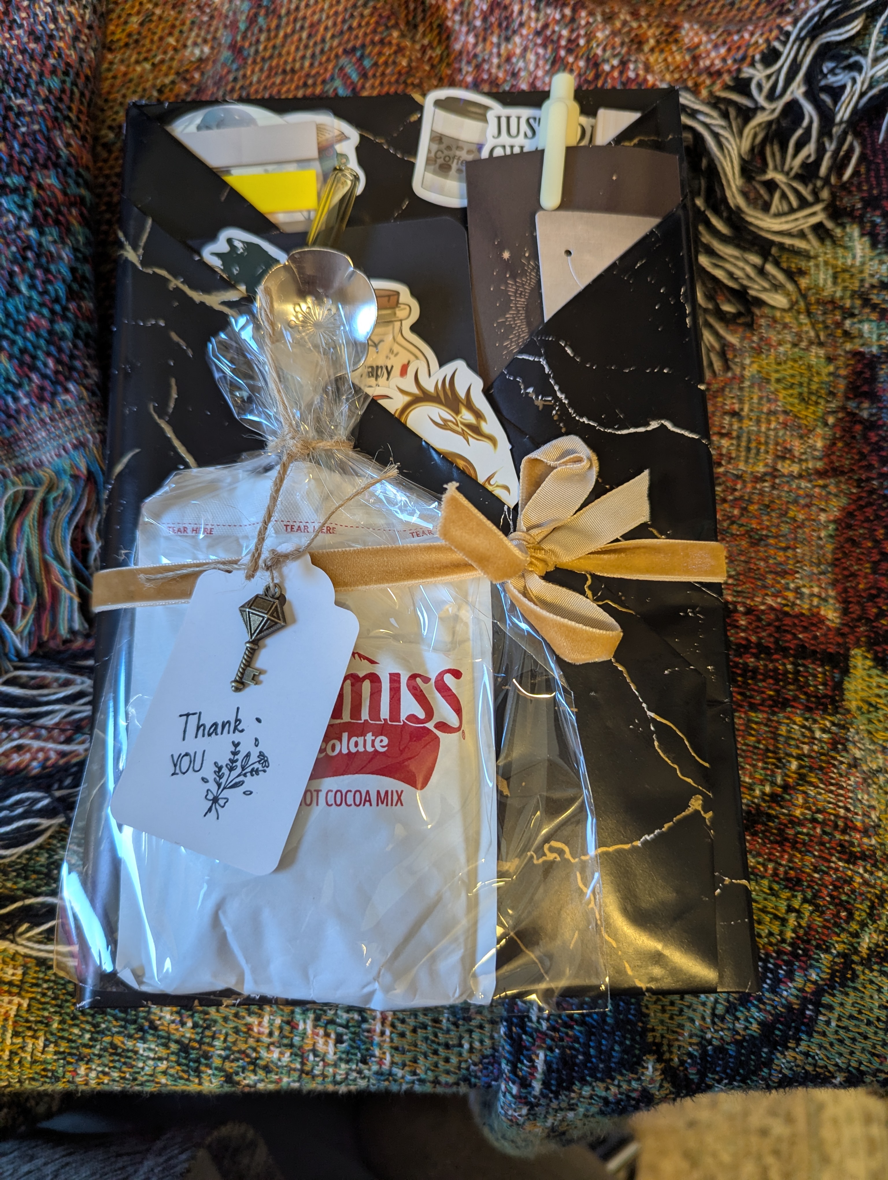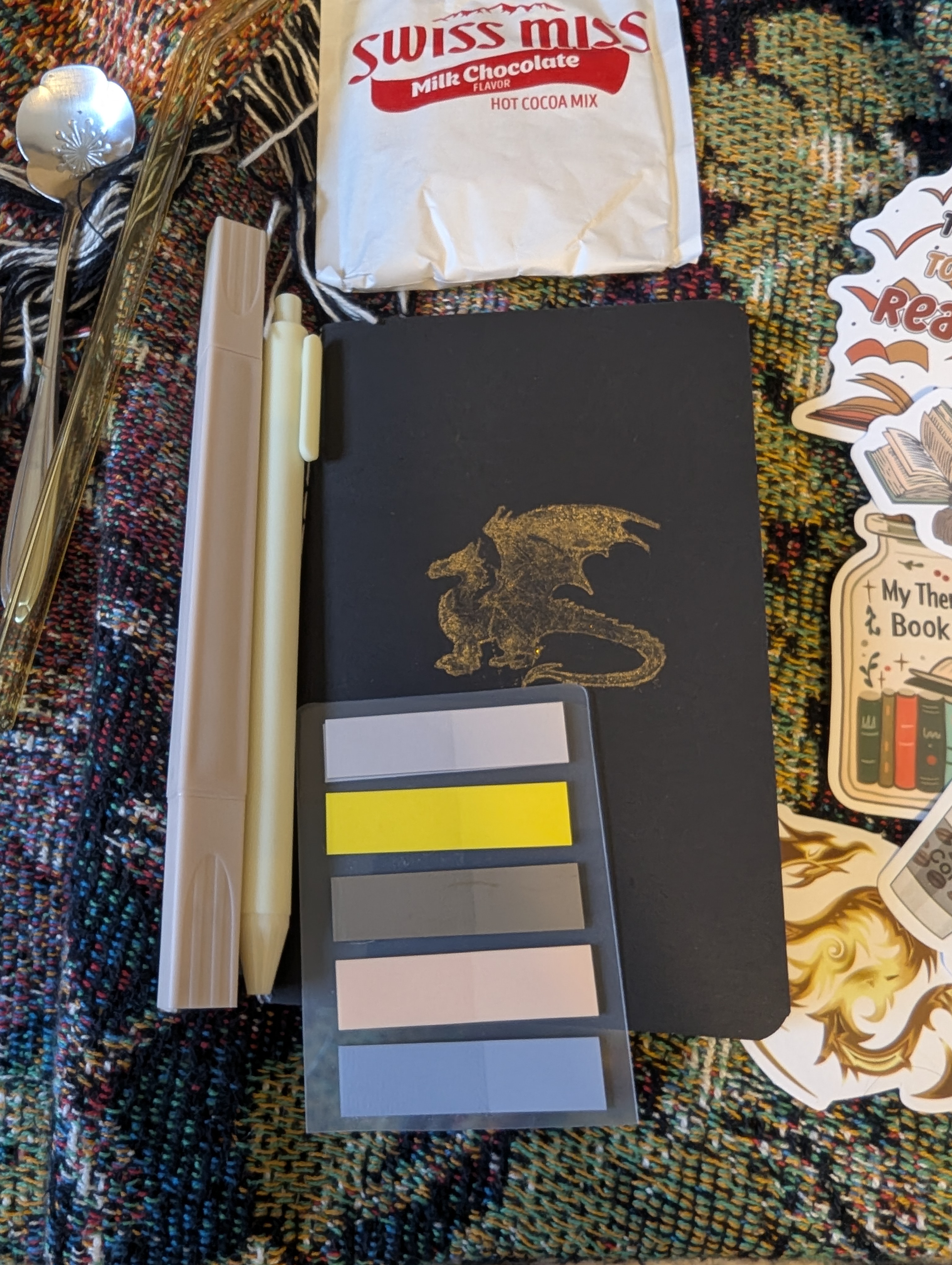 I can confirm that I got all the items that were promised, and they were packed up very nicely. The extra space in the box was taken up by packing peanuts so it wouldn’t move around and get damaged in the box. It had the classic blind date with a book box wrapping done where it creates pockets in the front for items to be put into. The hot coco was wrapped in plastic and tied off at the top with some string. The spoon and the straw were also in this packaging. I ended up getting a very yellow theme to my box with the pen, straw, socks, sticky tabs, and stickers having some element of yellow. (Just as a note: I didn’t select what color I wanted or request a specific color. I wanted some chaos and chaos I received!)