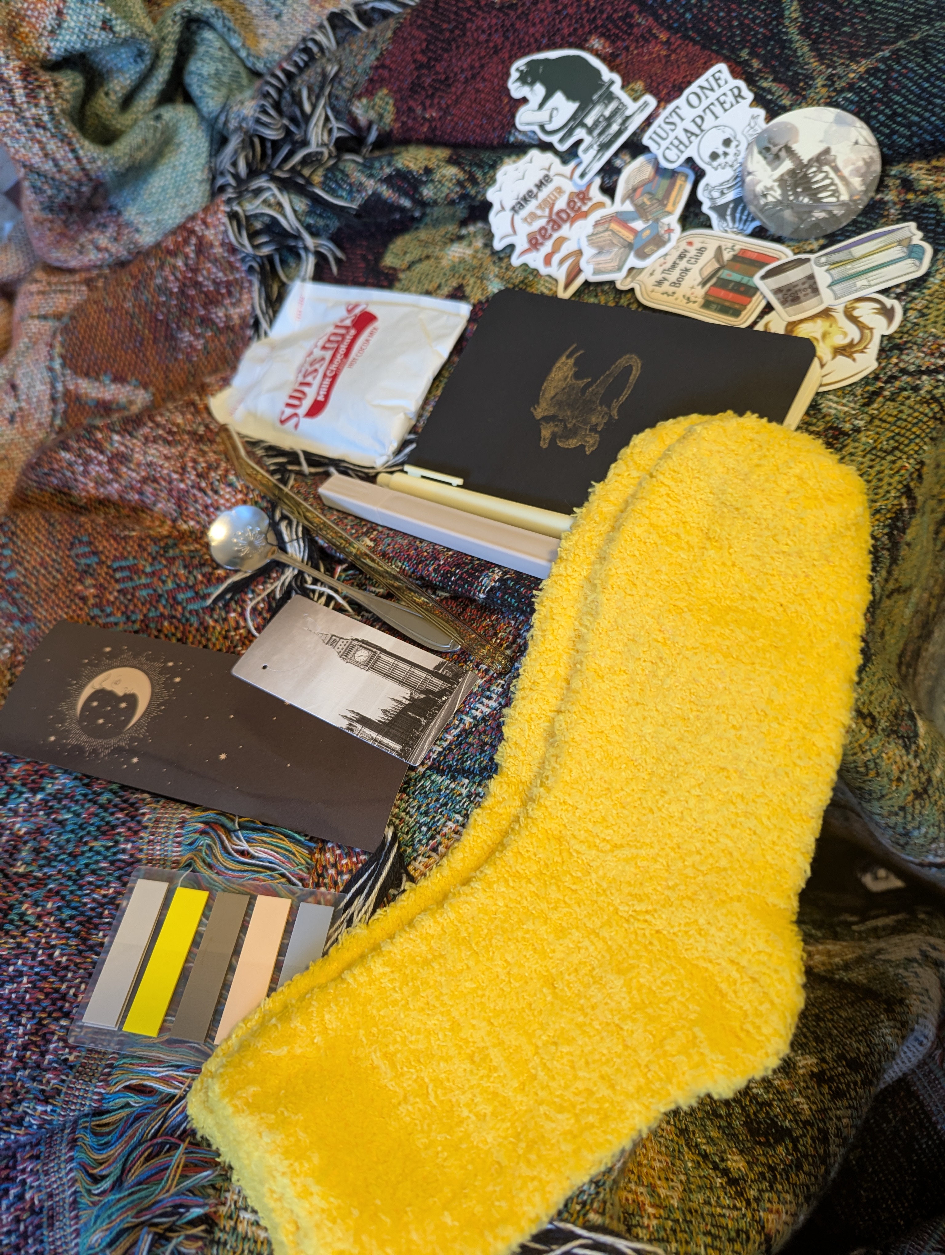 Now, for the most part, I really like the items I got with my box. The stickers are all really nice and a solid variety of bookish forward stickers. Also, I can confirm that the socks are soft and comfortable. I’m not really a yellow girl but honestly, I’m wearing comfy socks in my home when I want to be extra cozy so I don’t care what color they are! I absolutely love the little spoon and I’ll definitely use it as like a sugar spoon for my tea. It’s got a little flower design to it and it just brings me joy. I also rather like that the sticky tabs are a smaller set. I have so many now that I’m pretty sure I’m never going to use them all. I annotate pretty minimally when I’m reading so I don’t go through them very fast. I was also happy to see they were colors I might not have picked for myself. I like to match my tabs to either the cover of the book or the vibes it brings me, so having some colors I didn’t have previously was absolutely wonderful.