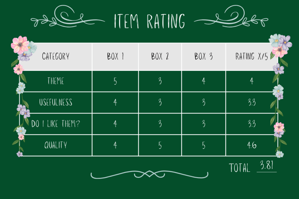 I’m rating the items in each box on 4 categories: theme, usefulness, do I like them, and quality. Theme technically has to do with both how much I enjoy the overall theme of the box as well as how well I think that the items represent the theme. I rate all of these categories on a 1-5 scale and then do some quick math (not a fan) to get a total rating that encompasses all categories across all three boxes.