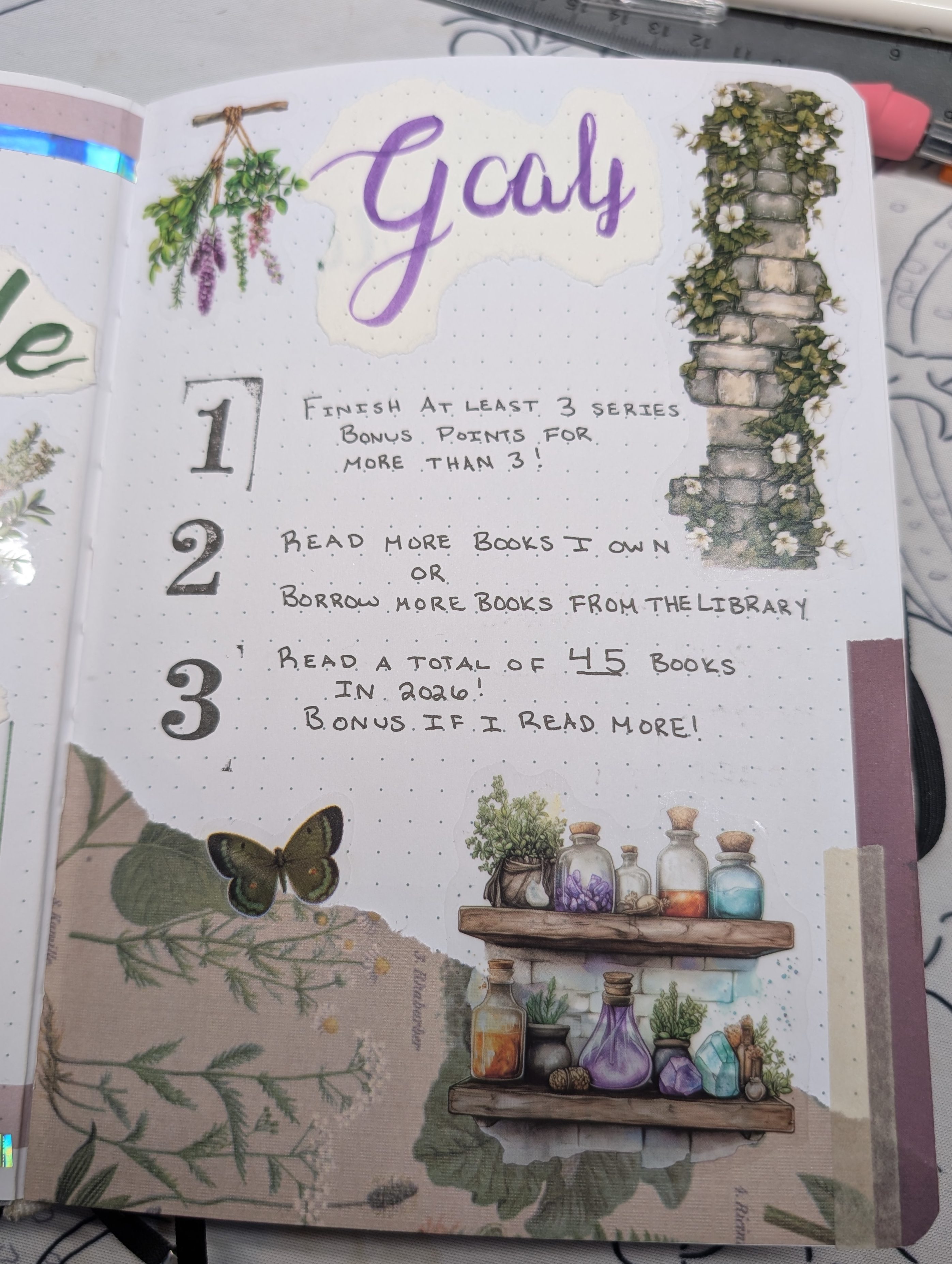 The title page! I want you to know that I re-did this entire page. Originally, I had this little door and a window and what looked like an old cottage type style, but I hated it. Every time I made a new spread, and I looked at that page, I was like, “this is just not fitting the vibe”. In the end, this is what I created. I did hand-lettering for the first time through this journal so it’s not perfect but I had fun. I went with an apothecary/botanical theme for 2026 (last year it was an academic theme).