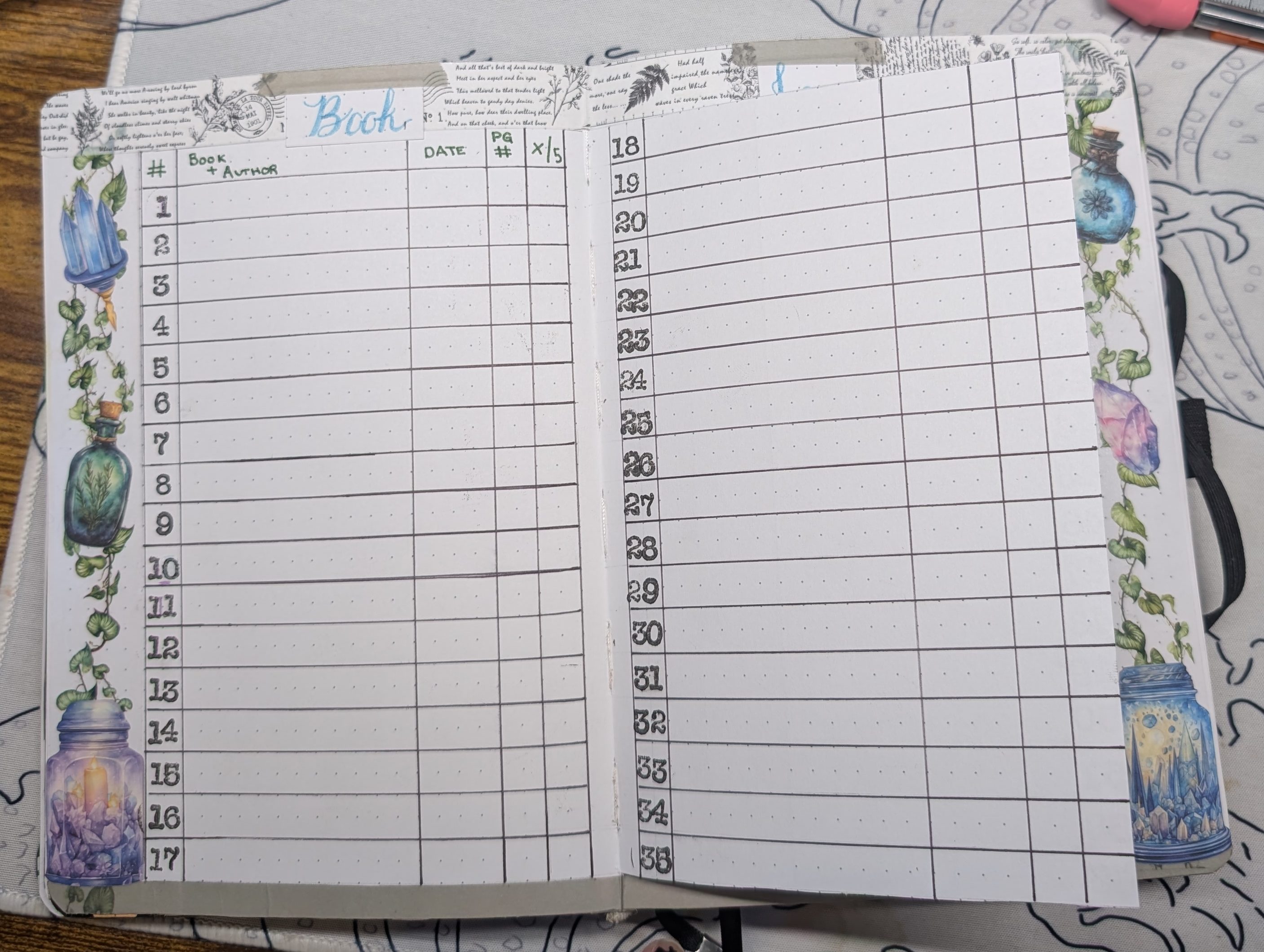 This is my version of the bookshelf tracker! There are 45 potions on these shelves and each time I finish a book, I’ll fill in a potion bottle. It took, so incredibly long to create this spread but I’m very happy how it came out. I wanted to do something a little different than a bookshelf this year and this is what I came up with!