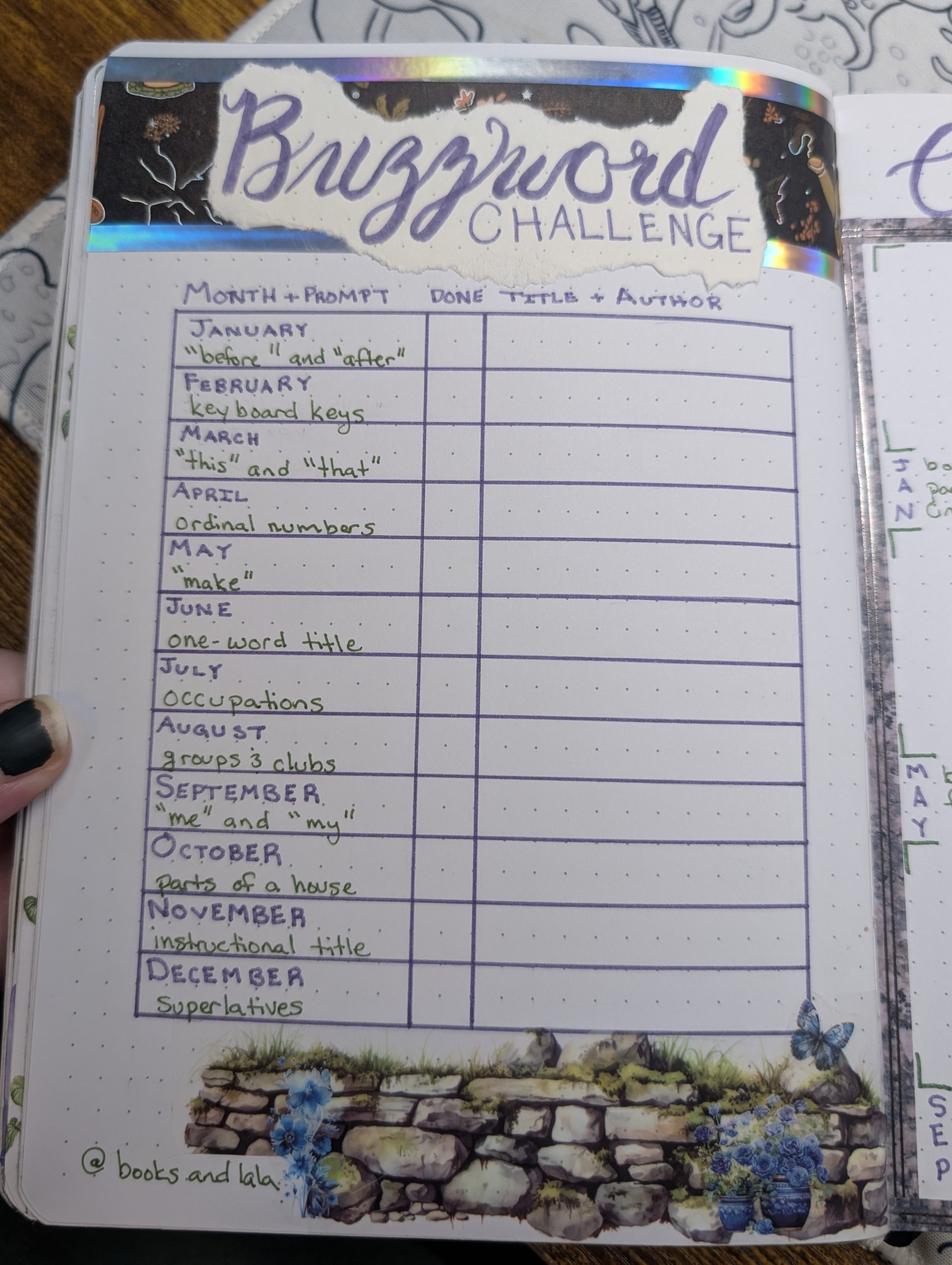 The last two pages! The challenges. Both of these challenges were created by booksnadlala. I saw these are her YouTube channel and they sounded like interesting challenges to do. I wanted to do something other than the Book Bingo that I did last year. This gives me two different challenges to try to accomplish each month; one for title and one for cover. I don’t do a lot of challenges typically but I wanted to try something new. These challenges also seem like a good way for me to pick up a book that I might not normally grab.